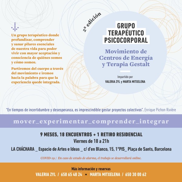 Un grupo terapéutico psicocorporal en el que combinaremos el Sistema de Centros de Energía y la Terapia Gestalt para hacer un recorrido de crecimiento personal profundo, vivencial y comprometido.